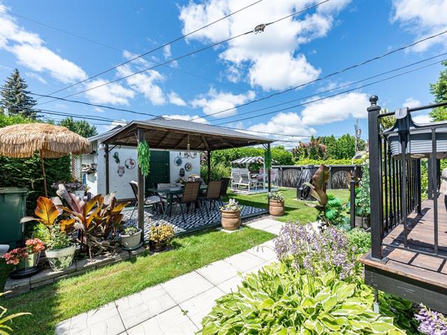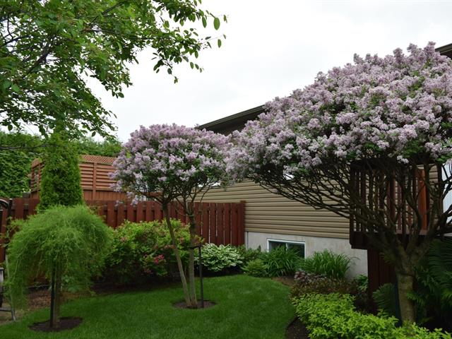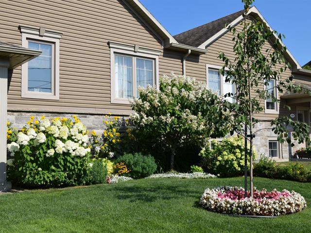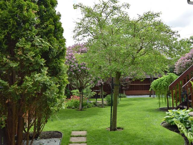 Aménagement paysager complet, avec murets de pierre, comprenant de multiples arbres de différentes essences réduisant les effets d'îlots de chaleur et créant un rideau d'intimité avec le voisinage et la rue.