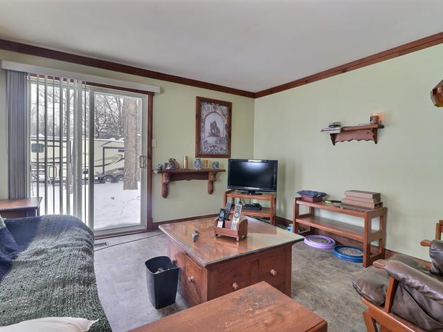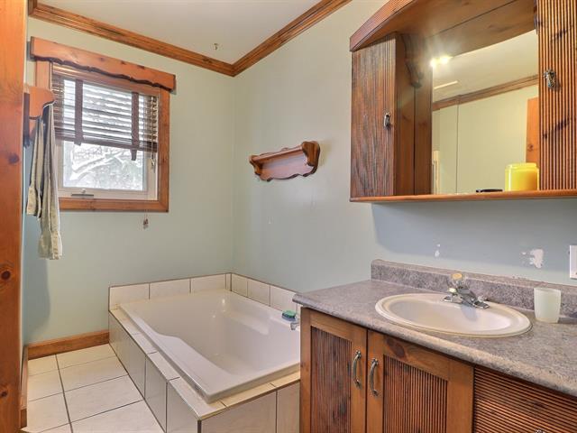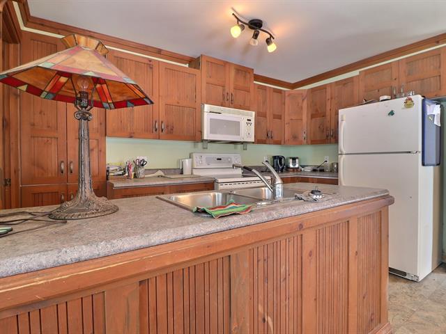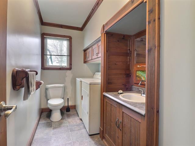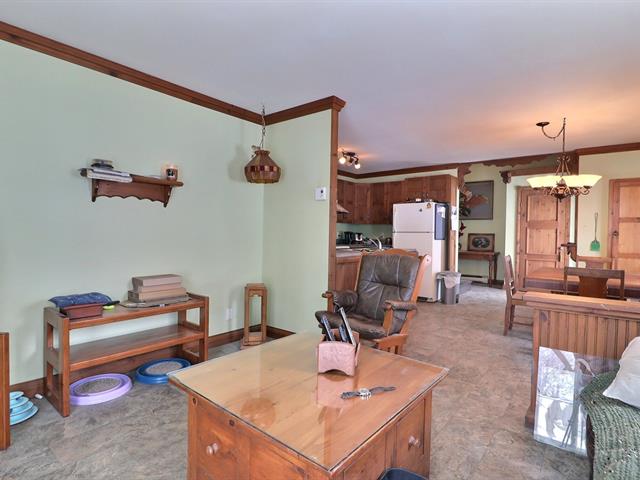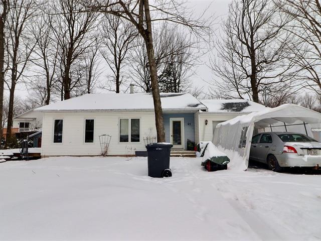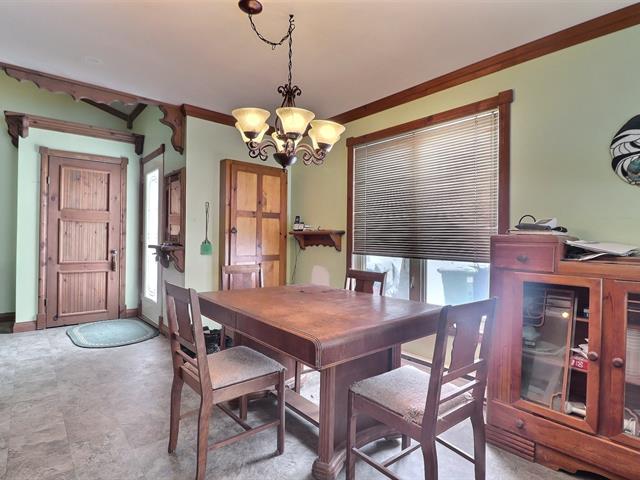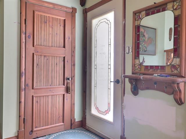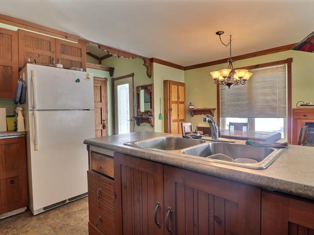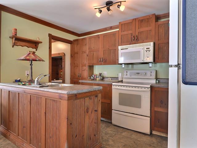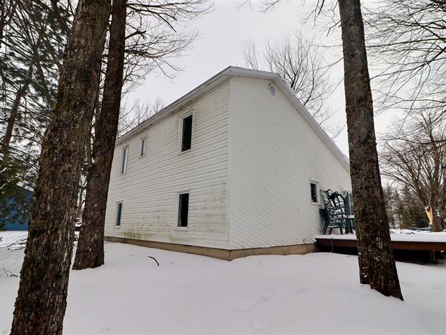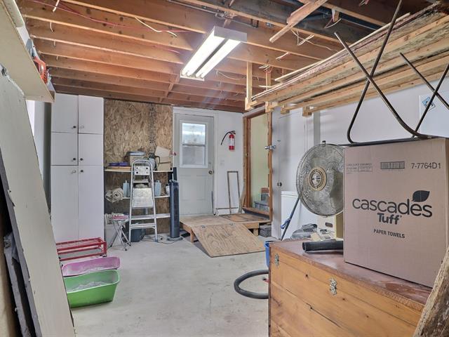 This charming property, featuring wood ceilings and walls, offers a warm and inviting atmosphere. Upon entering, you will find an open-concept layout that includes a kitchen with wooden cabinetry and a central island, a spacious dining area, and a living room enhanced by a wood stove. A designated space for a washer and dryer is located in the hallway. A well-sized bedroom and a full bathroom with a bathtub-shower combination complete the interior. Outside, a detached single-width garage complements the large wooded lot, which offers several green spaces and various development possibilities.