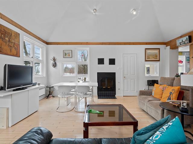Salon 2 chambres Magnifique cuisine Coin bureau Salle de bain avec salle de lavage Un deuxième salon aménagé dans le solarium, à aire ouverte avec la salle à manger, baigné de lumière naturelle grâce à son abondante fenestration. Le tout avec vue sur la montagne.