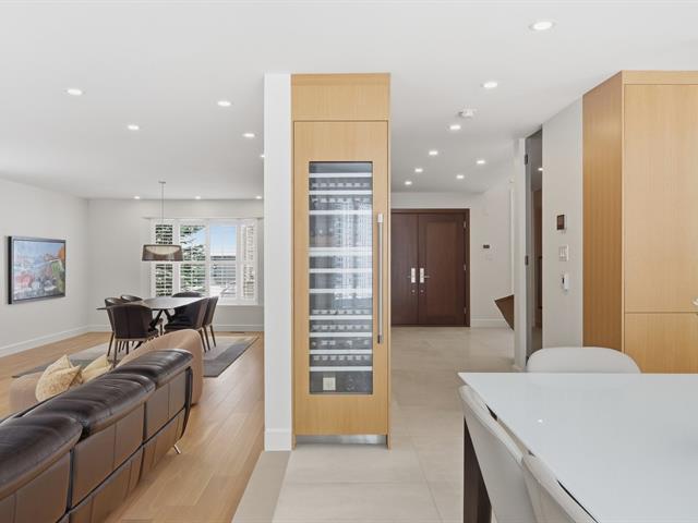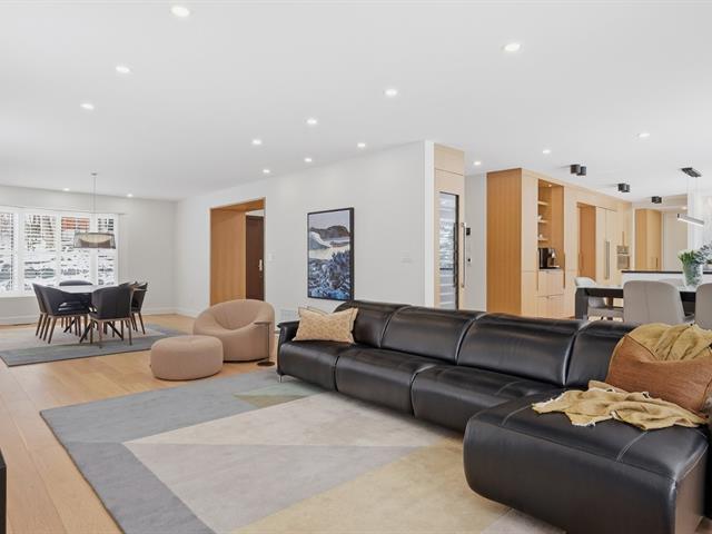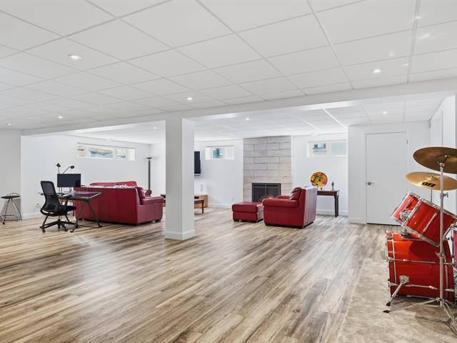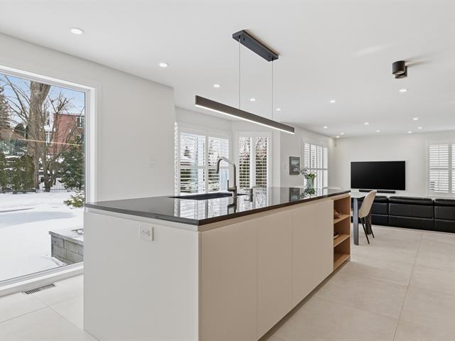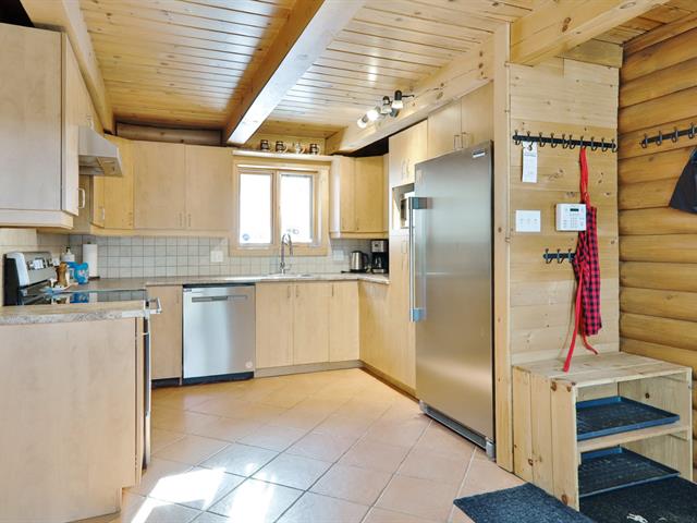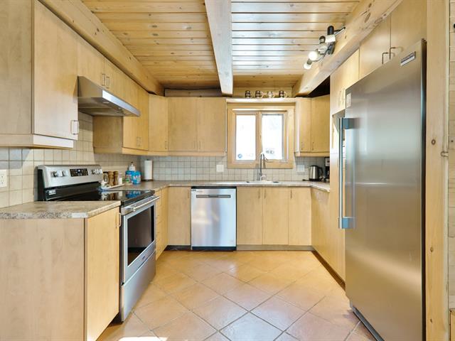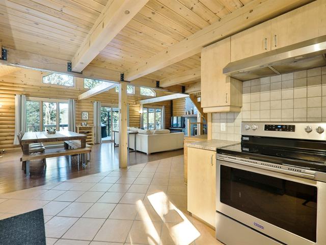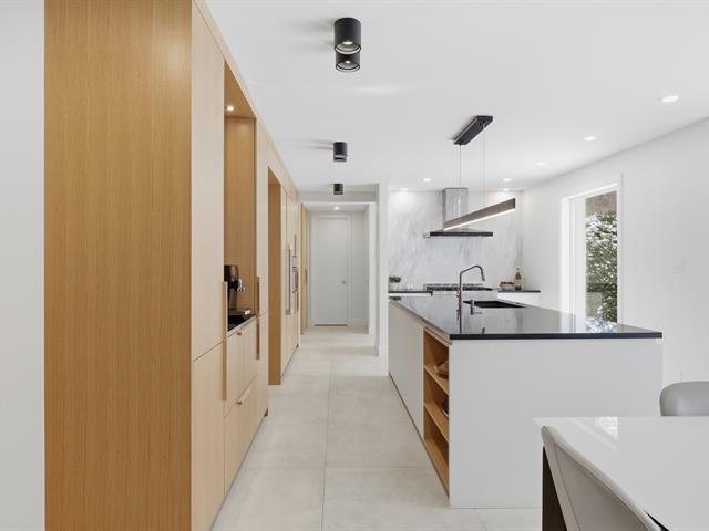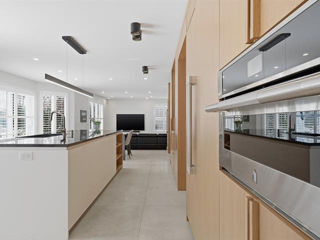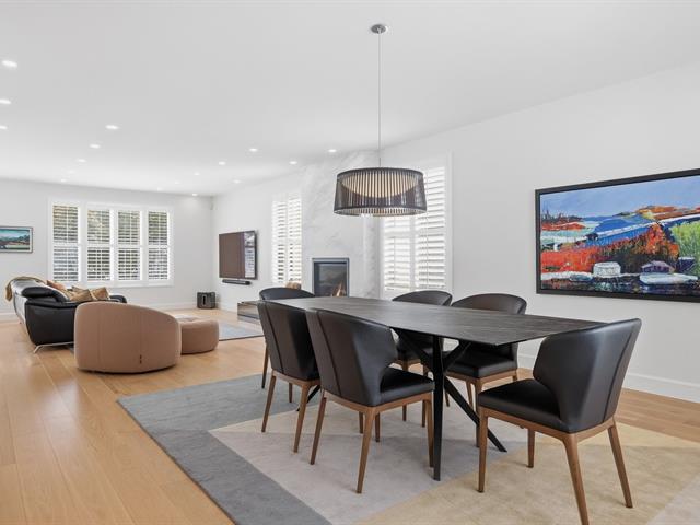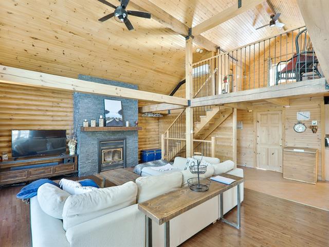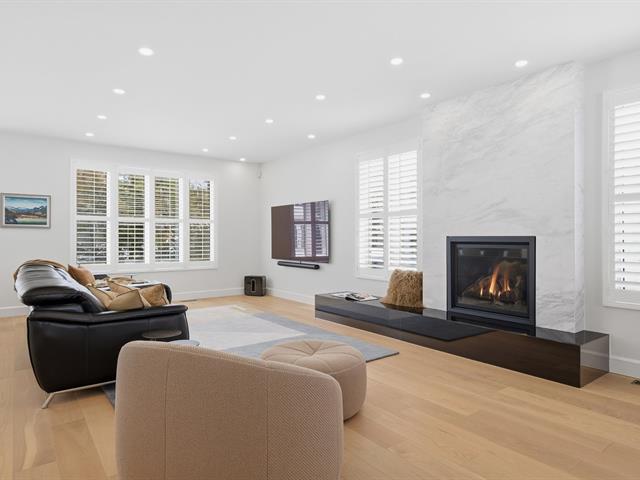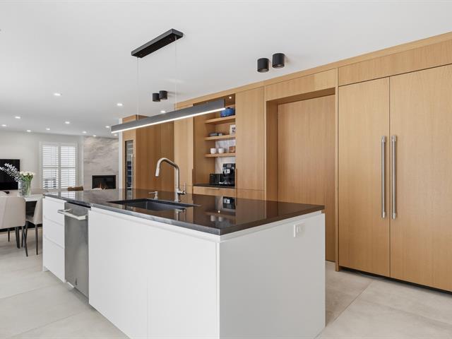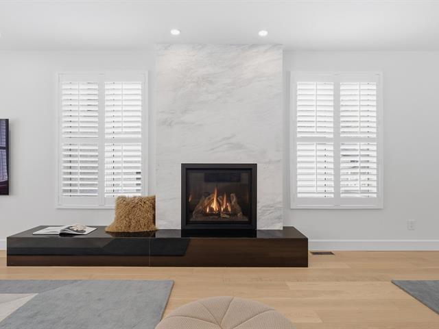 Le salon est agrémenté d'un foyer au propane. La cuisine offre des armoires en bois et un grand îlot central avec comptoir en quartzite, combinant élégance et fonctionnalité.