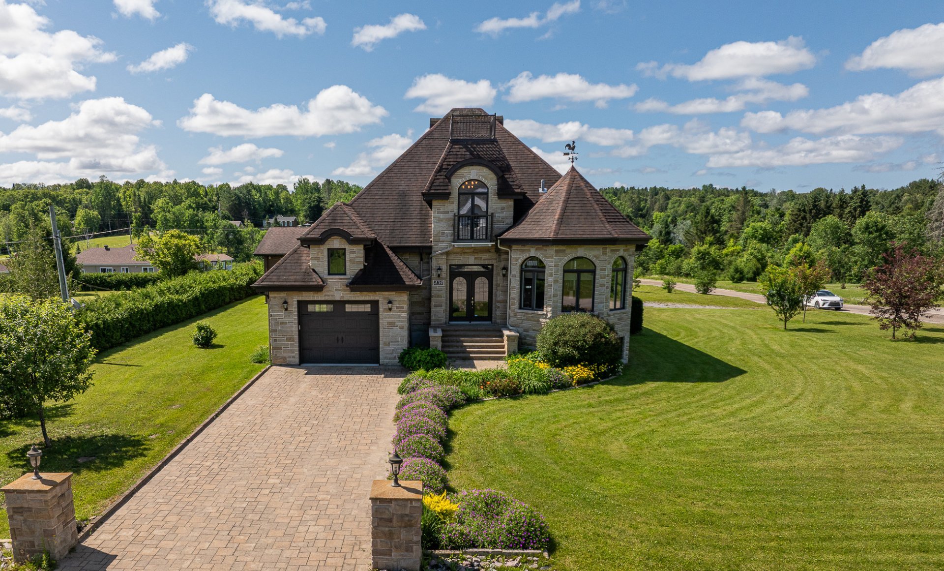Située dans un quartier prisé derrière l'hôpital, cette somptueuse propriété se distingue par ses matériaux haut de gamme et son aménagement impeccable. Implantée sur un terrain de 30 000 pi², elle vous accueille avec une entrée en pavé uni menant à un garage double détaché (2 portes) en plus d'un garage simple intégré (3 portes au total) -- parfait pour les passionnés d'automobile ou de grands espaces de rangement.