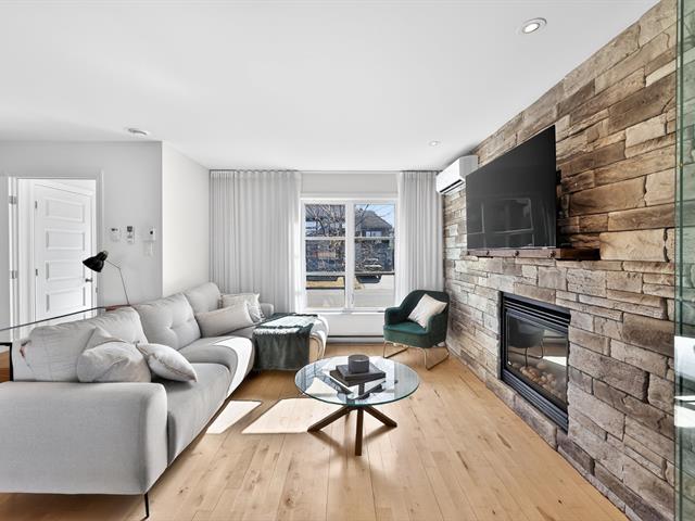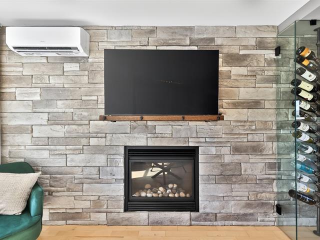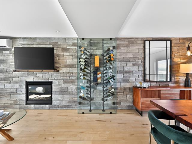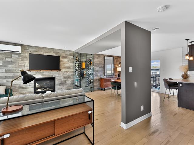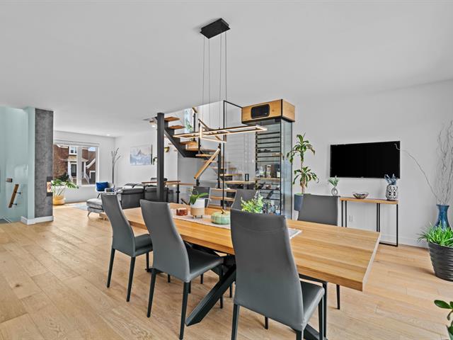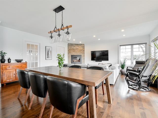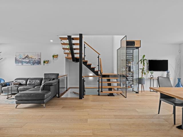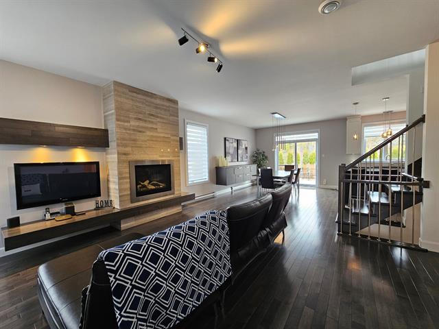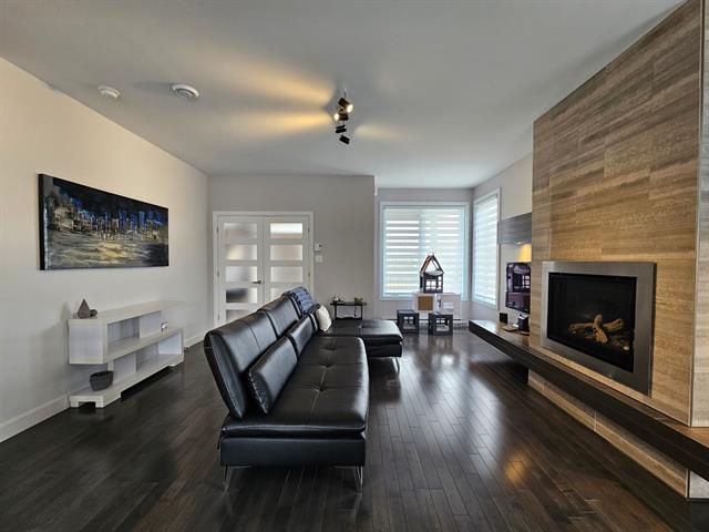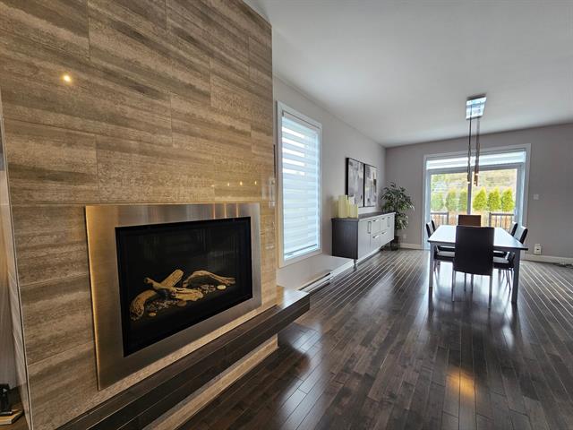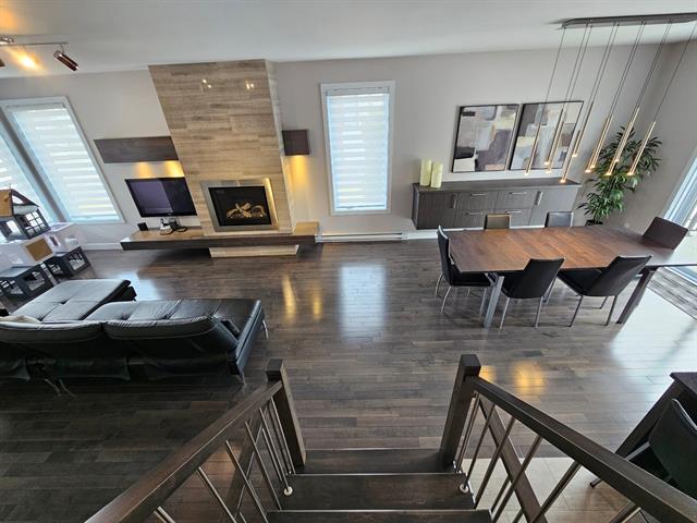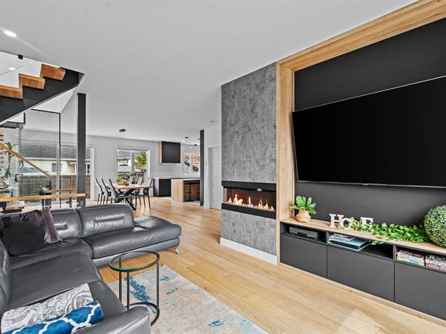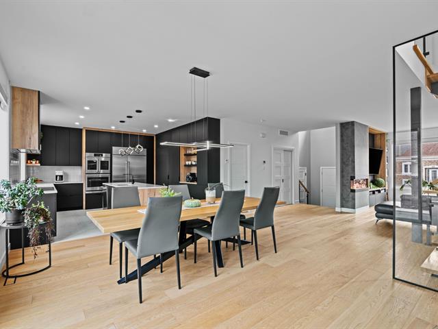 Le salon, agrémenté d'un foyer linéaire et d'un mur accent, apporte caractère et chaleur à l'ensemble. La salle à manger, parfaitement intégrée à l'aire de vie, permet d'accueillir famille et invités dans une atmosphère dès plus conviviale .