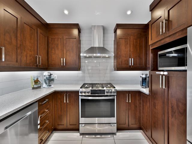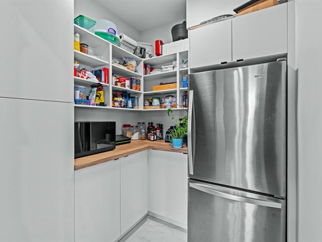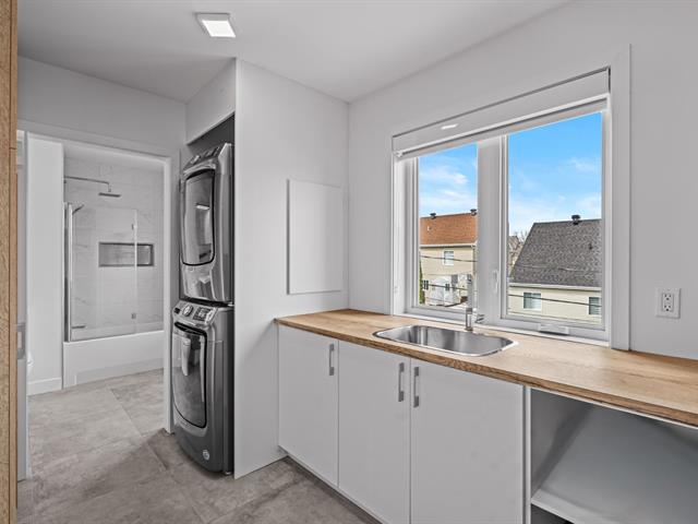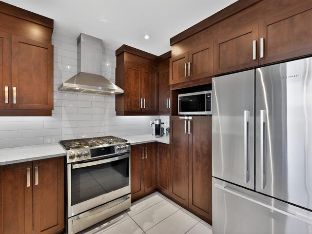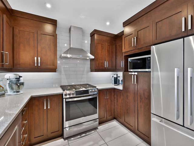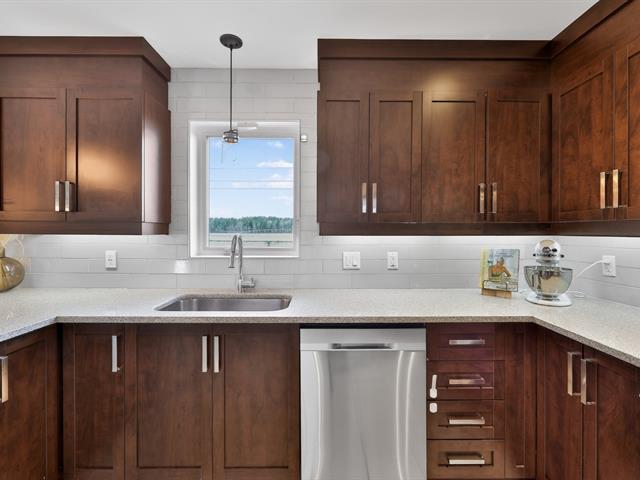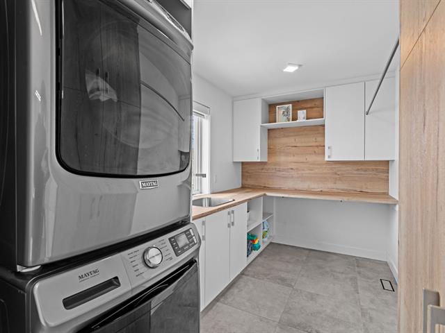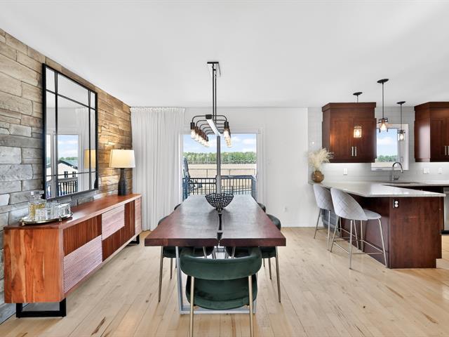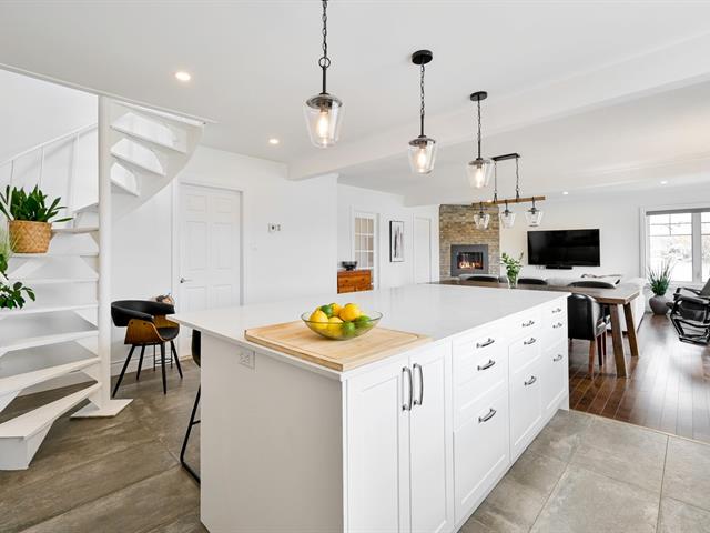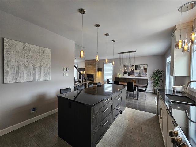 La cuisine constitue sans contredit l'une des pièces maîtresses de la résidence. Son immense îlot central devient rapidement le point de rassemblement de la maison. Armoires pleine hauteur, comptoirs de qualité et cuisinière au gaz composent un espace aussi élégant que fonctionnel. La porte-patio prolonge naturellement la pièce vers l'extérieur où une terrasse couverte avec cuisine extérieure permet de profiter pleinement des repas et des soirées d'été. Une salle d'eau spacieuse ainsi qu'une salle de lavage indépendante complètent le rez-de-chaussée.